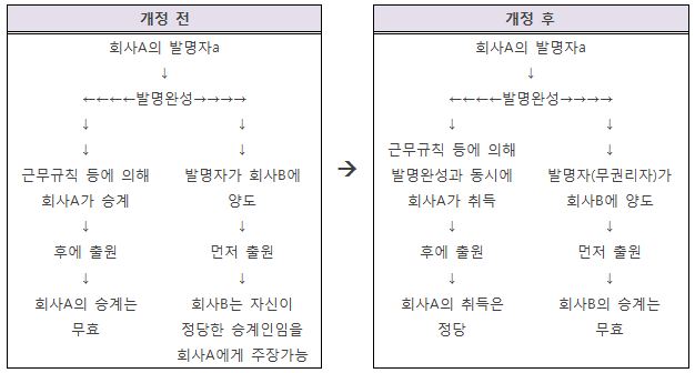 - 개정 전: 발명 완성 후에 공동발명자가 일단 지분을 나눠가진 후, 사용자 등에게 지분을 승계 - 개정 후: 발명 완성과 동시에 사용자 등이 지분을 취득(발명자의 동의 불필요)