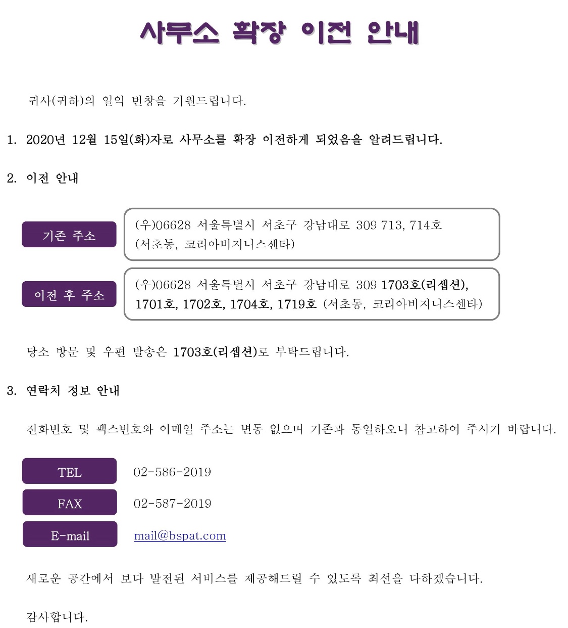 안녕하세요, 이공특허법률사무소입니다. 귀사(귀하)의 일익 번창을 기원드립니다. 2020년 12월 15일(화)자로 사무소가 확장 이전됨에 따라, 변경된 주소를 아래와 같이 안내