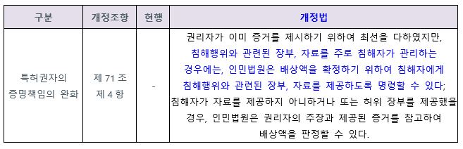∙ 특허권 고의 침해에 대해 법원이 특허권자의 손해의 1~5배 이내에서 손해배상금을 확정할 수 있도록 하였으며(징벌적 손해배상제도), 법정손해배상금[1]의 범위를 3만 위안~500만 위안으로 증액하였습니다. ☞ 징벌적 손해배상액, 법정손해배상액 증액 ∙ 특허권자가 최선을 다해 증거를 제시하였지만 특허의 침해의 증거가 대부분 침해자에게 있는 경우에 법원은 침해자에게 침해 활동과 관련된 증거(자료, 장부)를 제출하도록 명령할 수 있도록 하였습니다. ☞ 특허권자의 증명책임의 완화 ∙ 심사과정이 길어져 존속기간이 짧아진 특허들에 대해 존속기간을 보상해주는 제도를 마련하였습니다. 또한, 의약품 관련 특허의 특허권자가 의약품의 시장판매 허가를 위해 실시하지 못한 기간에 대해서 존속기간을 보상하는 제도를 마련하였습니다. ☞ 특허권 존속기간 보상제도 도입 ∙ 의약품의 시장판매 심사 중에, 해당 의약품의 허가 신청인과 해당 의약품과 관련된 특허의 특허권자 사이에 상기 특허로 인한 분쟁이 생길 우려가 있는 경우, 상기 허가 신청인은 법원에 해당 의약품이 위 특허의 권리범위에 속하는지 여부에 대한 판결을 청구할 수 있어 특허분쟁이 조기에 해결될 수 있도록 하였습니다. ☞ 의약품의 특허분쟁 조기 해결 메커니즘 도입 ∙ 특허권 침해소송의 시효를 현행 2년에서 3년으로 연장하였습니다. 시효는 특허권자 또는 이해관계자가 침해행위 및 침해자를 안 날 또는 당연히 알아야 하는 날로부터 계산됩니다. ☞ 특허권침해소송의 시효 연장