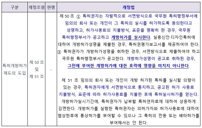 ∙ 특허권자는 자신의 특허를 타인(타 업체)이 실시하는 것을 허용한다는 서면을 자발적으로 제출하고, 실시권(라이선스)에 대한 공개와 실시료 기준 등을 정해 공고하면, 이를 실시하길 원하는 자는 특허권자에게 해당 특허에 대한 실시료를 지불하고 해당 특허를 실시하는 ‘개방허가(开放许可, 오픈 라이선스)’ 제도를 신설하였습니다. ☞ 특허개방허가제도의 도입 ∙ 중앙 특허 행정부처의 특허정보 공공서비스 시스템 구축을 통한 특허 정보 보급과 활용 촉진 및 특허의 실시 및 활용을 촉진하기 위한 지방 행정부처의 책임을 명시하였습니다. ☞ 특허정보 공공서비스체계 건설 (3) 디자인의 보호 강화