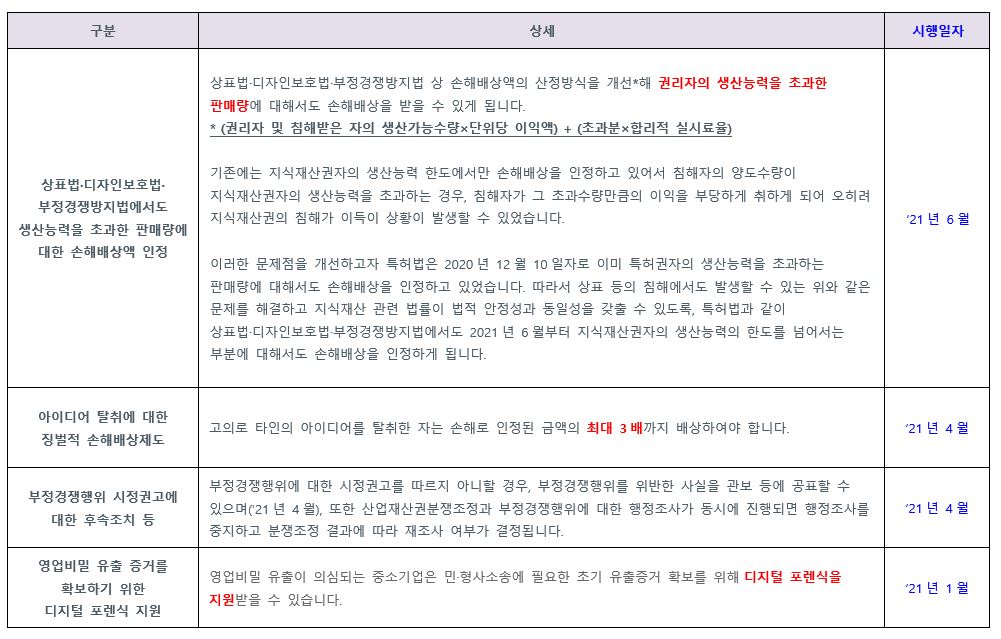 ![]() (출처: 특허청) 특허청은 손해배상범위 확대, 아이디어 탈취에 대한 징벌적 손해배상제도 시행, 중소기업의 특허 조사·분석비용 세액공제 포함, 모바일 특허출원 시스템 도입 등 ‘2021년 새롭게 달라지는 지식재산 제도’를 발표했습니다.