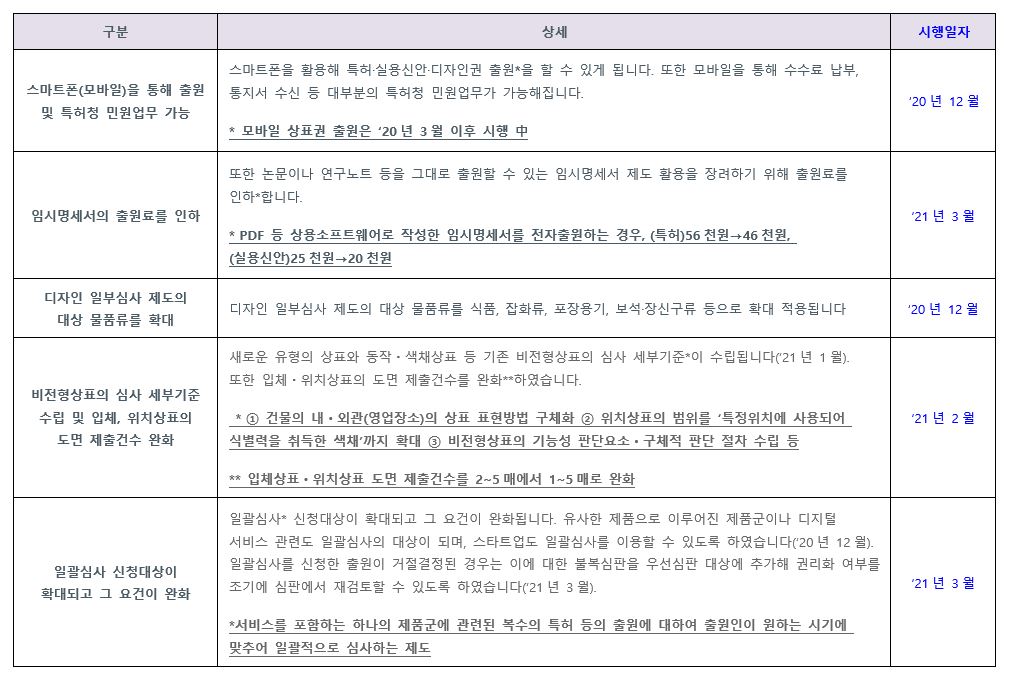 (4) 기타 지식재산 제도 △ 시니어 퇴직인력의 특허기반 기술창업 지원(‘21년 1월), △특허심판 사건에서 영상 구술심리 및 기술설명회 확대(‘21년 1월) 등의 제도가 새롭게 시행됩니다.