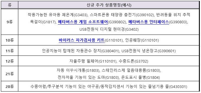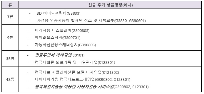 · 제31차 니스(NICE) 상품분류 전문가회의에서 채택된 신규 상품명칭 3D 바이오프린(G3833) 가정용 인공지능이 탑재된 청소 및 세탁로봇(G3830, G390601) 9류머리착용 디스플레이(G390803) 웨어러블스피커(G390701) 자동화진단용스캐너장치(G390803) 35류 인플루언서 마케팅업(S0101) 컴퓨터화 된 의료기록 및 파일관리업(S123301) S123301) 42류 컴퓨터로 시뮬레이션된 모델 디자인업(S121302) 데이터처리용 컴퓨터프로그래밍업(G390802, S123301) 블록체인기술을 이용한 사용자인증 서비스업(G390802, S123301) · 디지털 전환 시대에 선제적으로 대응하기 위해 출원이 예상되는 신규혁신 상품의 고시명칭 타당성을 검토(실태조사 등)하여 명칭 추가 착용가능한 유아용 체온계(G3403), 스마트폰용 태양광 충전기(G390102), 반려동물 위치 추적 목걸이(G1817), 메타버스용 게임 소프트웨어(G390802), 메타버스용 인터페이스(G390803), USB전원식 디지털 현미경(G3402) 바이러스 자가검사용 키트(G110101), 인공췌장(G110101) 인공지능이 탑재된 자동관수 장치(G380401), USB전원식 냉온장고(G390601) 자율주행 휠체어(G110101), 수중드론(G3702) 자동 이쑤시개통(G1803), 스테인리스제 얼음대용품(G1803), 전자저울 기능이 있는 도마(G1803), 온도표시 물병(G1804) 수중아령/투구분석 기능이 있는 야구공/동작감지센서 기능이 있는 줄넘기용 줄(G430301)