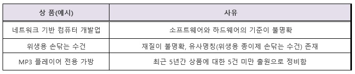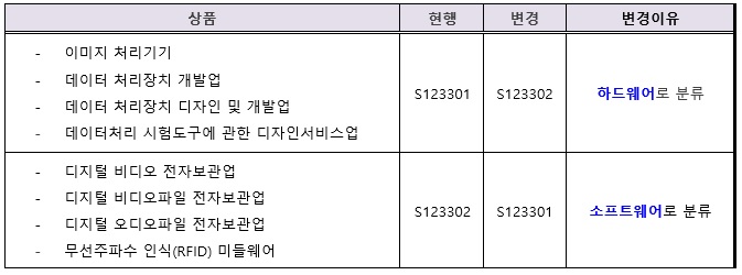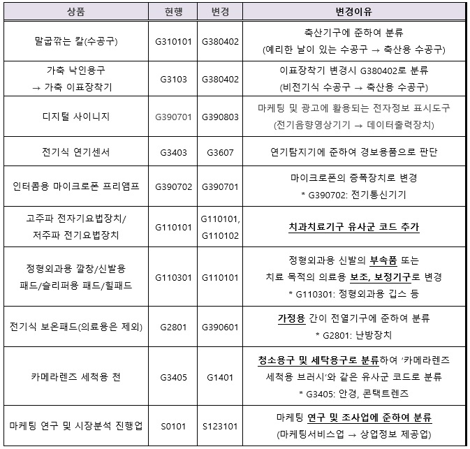 말굽깎는 칼(수공구) G310101 G380402 축산기구에 준하여 분류(예리한 날이 있는 수공구 → 축산용 수공구) 가축 낙인용구 가축 이표장착기G3103 G380402 이표장착기 변경시 G380402로 분류 (비전기식 수공구 → 축산용 수공구) 디지털 사이니지 G390701 G390803 마케팅 및 광고에 활용되는 전자정보 표시도구 (전기음향영상기기 → 데이터출력장치)전기식 연기센서G3403G3607연기탐지기에 준하여 경보용품으로 판단인터콤용 마이크로폰 프리앰프G390702 G390701 마이크로폰의 증폭장치로 변경* G390702: 전기통신기기고주파 전자기요법장치/저주파 전기요법장치 G110101 G110101,G110102 치과치료기구 유사군 코드 추가정형외과용 깔창/신발용패드/슬리퍼용 패드/힐패드G110301G110101 정형외과용 신발의 부속품 또는치료 목적의 의료용 보조, 보정기구로 변경* G110301: 정형외과용 깁스 등전기식 보온패드(의료용은 제외) G2801 G390601 가정용 간이 전열기구에 준하여 분류* G2801: 난방장치카메라렌즈 세척용 천 G3405 G1401청소용구 및 세탁용구로 분류하여 ‘카메라렌즈세척용 브러시’와 같은 유사군 코드로 분류* G3405: 안경, 콘택트렌즈마케팅 연구 및 시장분석 진행업 S0101 S123101 마케팅 연구 및 조사업에 준하여 분류(마케팅서비스업 → 상업정보 제공업)이미지 처리기기데이터 처리장치 개발업데이터 처리장치 디자인 및 개발업데이터처리 시험도구에 관한 디자인서비스업S123301 S123302 하드웨어로 분류 디지털 비디오 전자보관업 디지털 비디오파일 전자보관업 디지털 오디오파일 전자보관업 무선주파수 인식(RFID) 미들웨어 S123302 S123301 소프트웨어로 분류