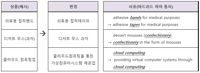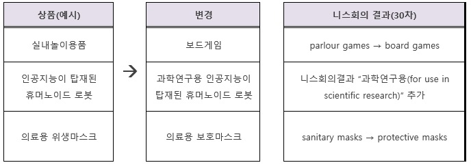 ▶ 니스 상품명칭 변경 및 영문명칭 오류 정정에 따른 고시명칭 변경(555개) · 니스 상품분류 11판-2022버전 반영에 따른 고시명칭 국문 변경 실내놀이용품 보드게임 parlour games → board games 인공지능이 탑재된 휴머노이드 로봇 과학연구용 인공지능이 탑재된 휴머노이드 로봇 니스회의결과 “과학연구용(for use in scientific research)” 추가의료용 위생마스크 의료용 보호마스크 sanitary masks → protective masks · 영문명칭 오류 정정에 따른 고시명칭의 국문 변경 의료용 접착밴드 의료용 접착테이프 adhesive bands for medical purposes adhesive tapes for medical purposes 디저트 무스(과자) 디저트 무스 과자 dessert mousses [confectionery] confectionery in the form of mousses 클라우드 컴퓨팅업 클라우드컴퓨팅을 통한 가상컴퓨터시스템 제공업 cloud computing providing virtual computer s through cloud computing · 오번역․오타 정정 등 기타 변경사유로 인한 국문 변경