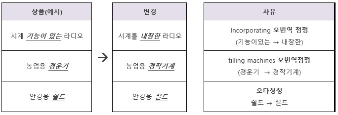 시계 기능이 있는 라 디오 시계를 내장한 라디오 Incorporating 오번역 정정 (기능이있는 → 내장한) 농업용 경운기 농업용 경작기계 tilling machines 오번역정정 (경운기 → 경작기계) 안경용 쉴드 안경용 실드 오타정정 쉴드 → 실드 ▶ 고시목록 내실화를 위한 상품명칭 삭제(365건) · 불명확한 지정상품 명칭 및 출원이 저조한 명칭(5년간 히팅수 5회 이하) 등 삭제 네트워크 기반 컴퓨터 개발업 소프트웨어와 하드웨어의 기준이 불명확 위생용 손닦는 수건재질이 불명확, 유사명칭(위생용 종이제 손닦는 수건) 존재 MP3 플레이어 전용 가방 최근 5년간 상품에 대한 5건 미만 출원으로 정비함