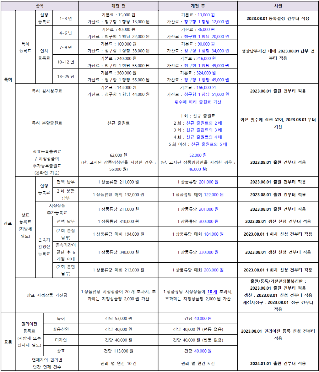 ![]() 특허, 상표 등의 지식재산권 수수료에 관한 사항을 규정하는 「특허료 등의 징수규칙」이 일부 개정되어 2023년 8월 1일부터 시행 되었습니다.