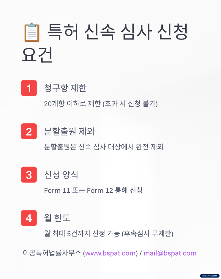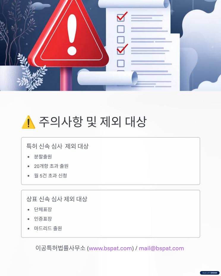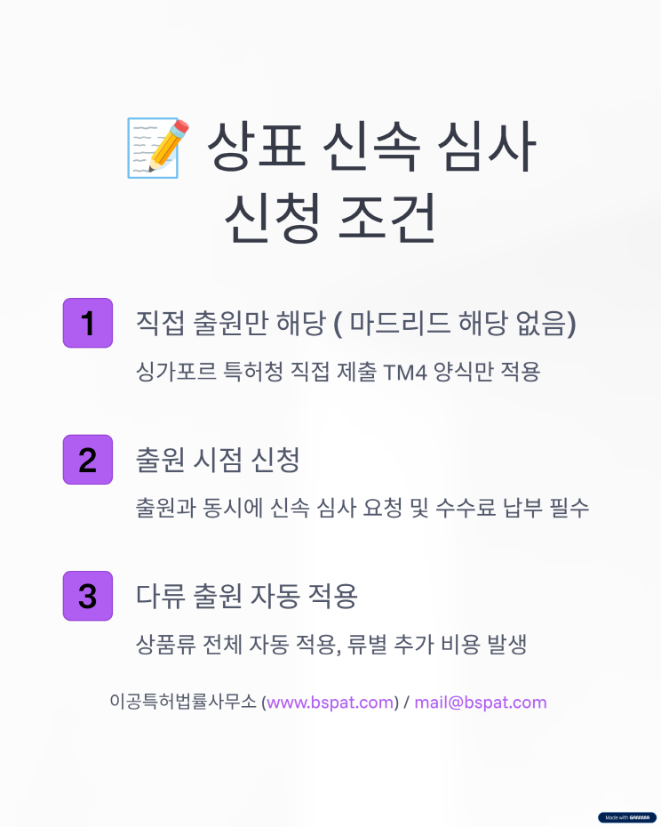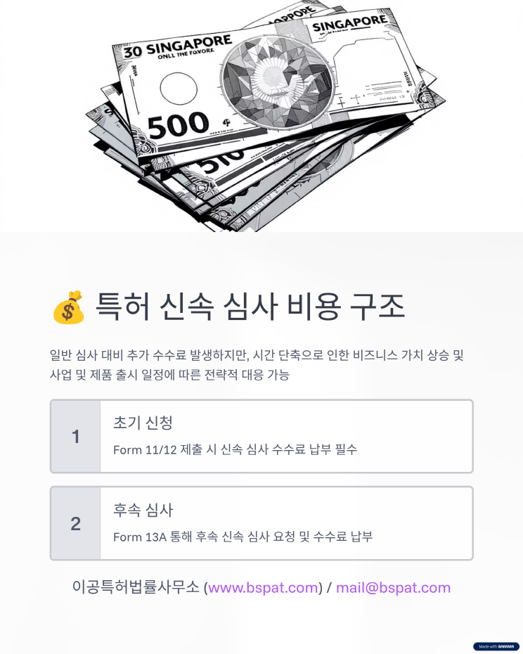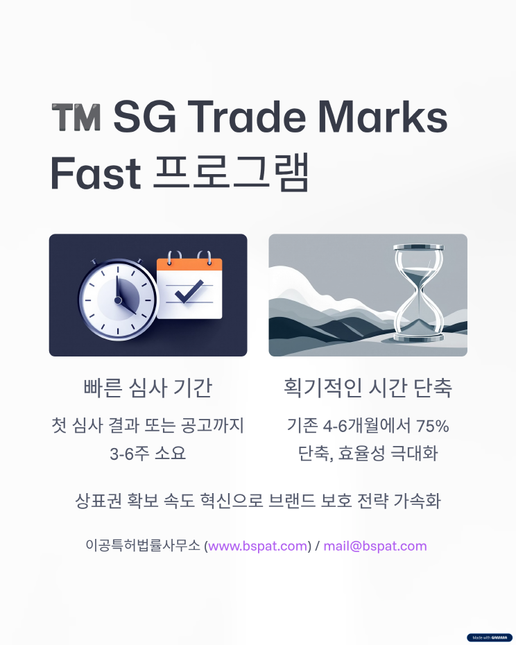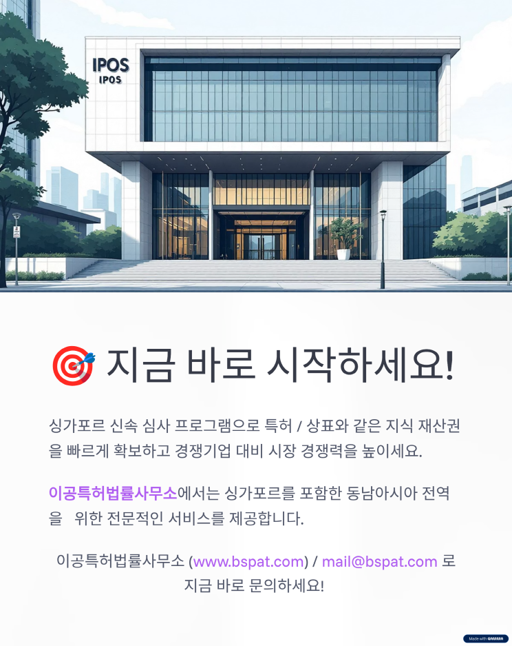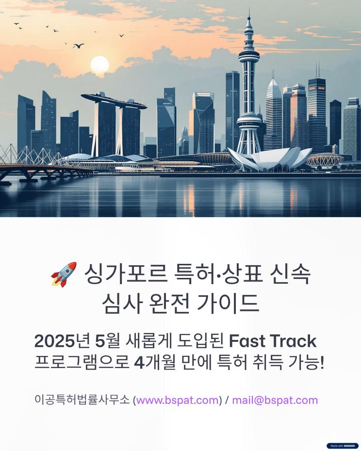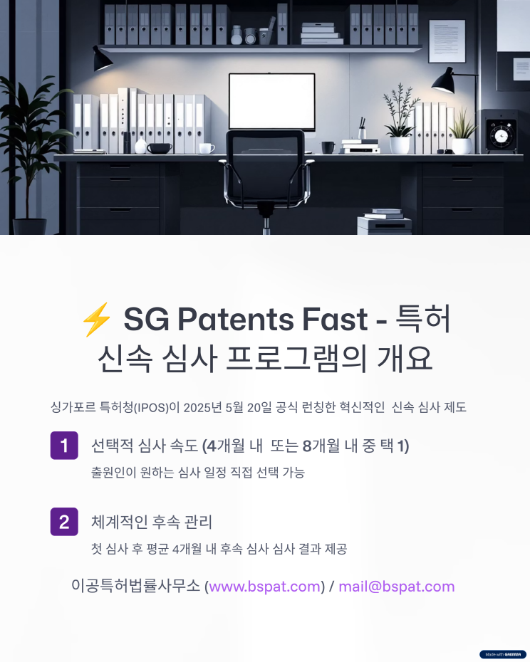 📢 싱가포르 특허·상표, 더 빠르게 등록하세요! 안녕하세요, 이공특허법률사무소 입니다. 2025년 5월부터, 싱가포르에서 특허와 상표를 빠르게 확보할 수 있는 신속 심사 제도가 도입되었습니다. ✅ 특허: 출원 후 4개월 또는 8개월 내 첫 심사 결과 ✅ 상표: 3~6주 이내 첫 심사 또는 공고 통지 브랜딩과 시장 진입, 이제 속도가 경쟁력입니다. 싱가포르 출원을 고려 중이시라면, 지금 저희에게 문의 주세요. 📧 mail@bspat.com ![]() ![]() ![]() ![]() ![]() ![]() ![]() ![]() ![]() ![]()