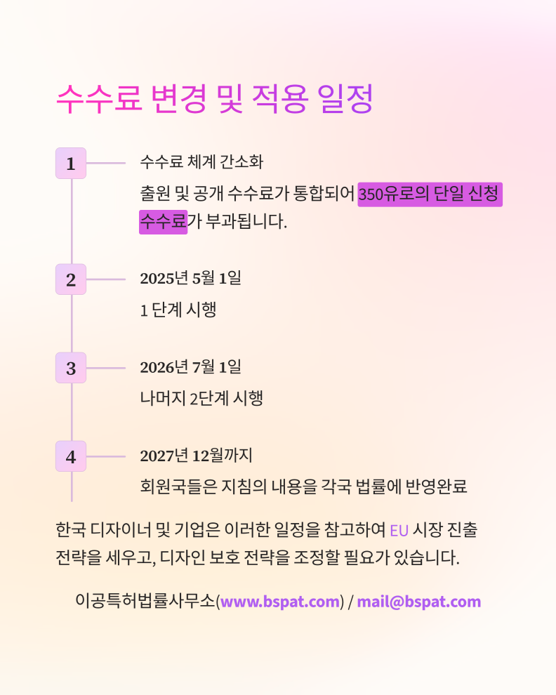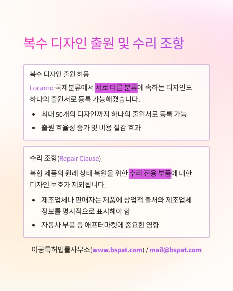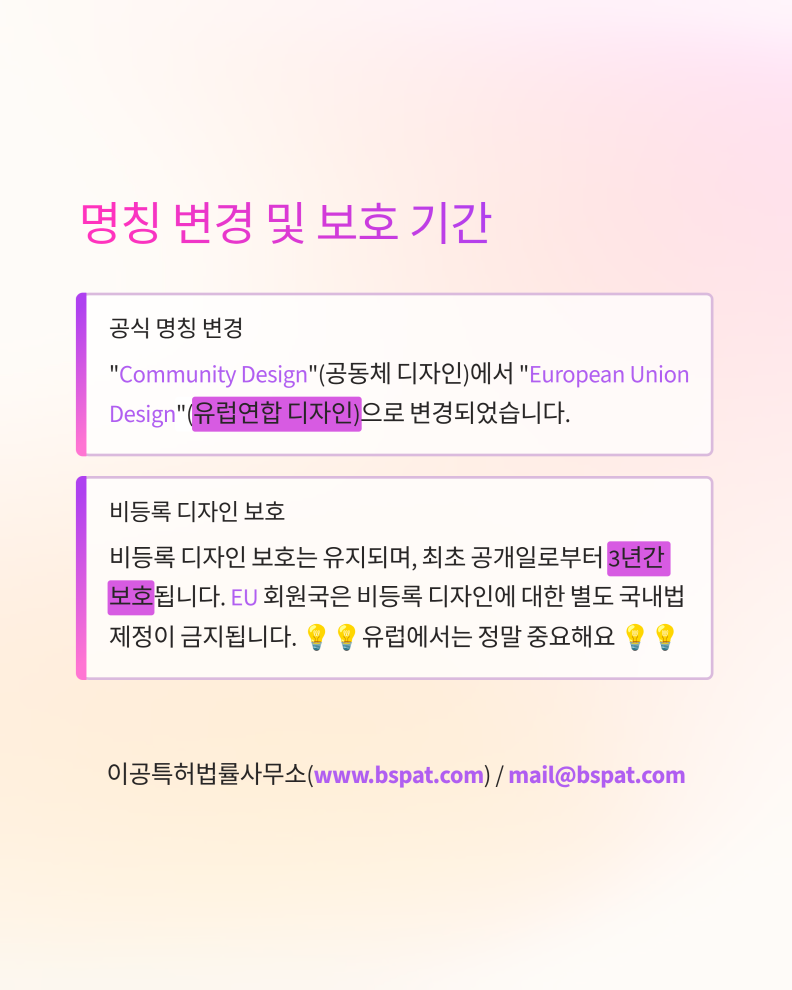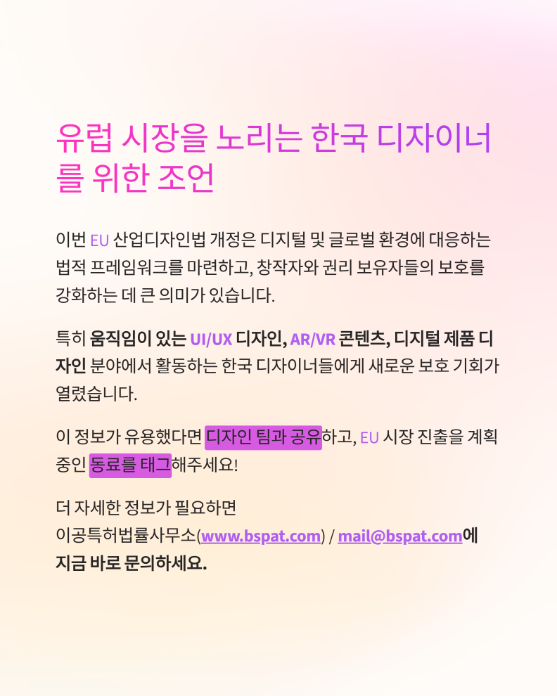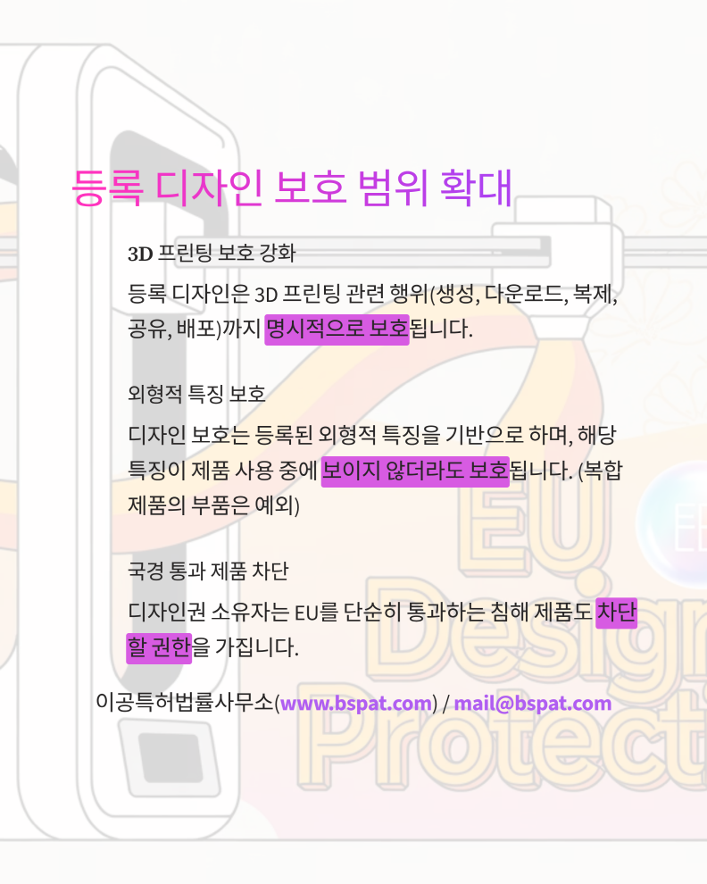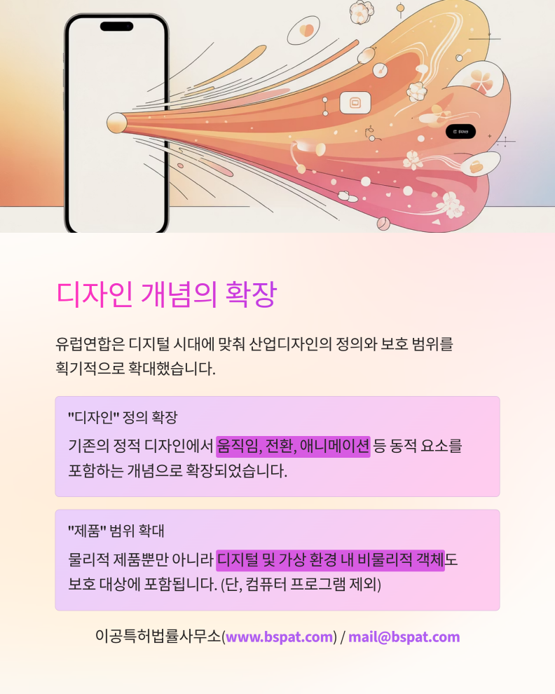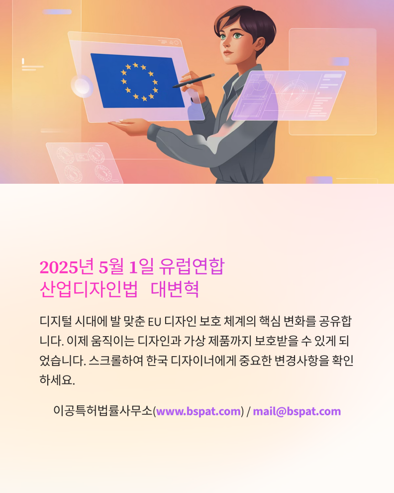 디지털 시대에 맞춘 대규모 개편이 드디어 시행됐습니다. 💡 주요 변화 한눈에 보기 ✔ 디자인 정의 확대: 애니메이션·전환 효과도 포함 ✔ 제품 정의 확대: 로고·UI 등 디지털 제품도 보호 ✔ 3D 프린팅 침해 명시적 보호 📩 자세한 사항은 #이공특허법률사무소에 지금 바로 문의하세요. 📧 mail@bspat.com ![]() ![]() ![]() ![]() ![]() ![]() ![]()