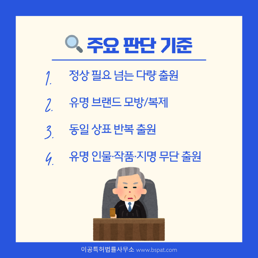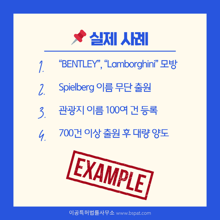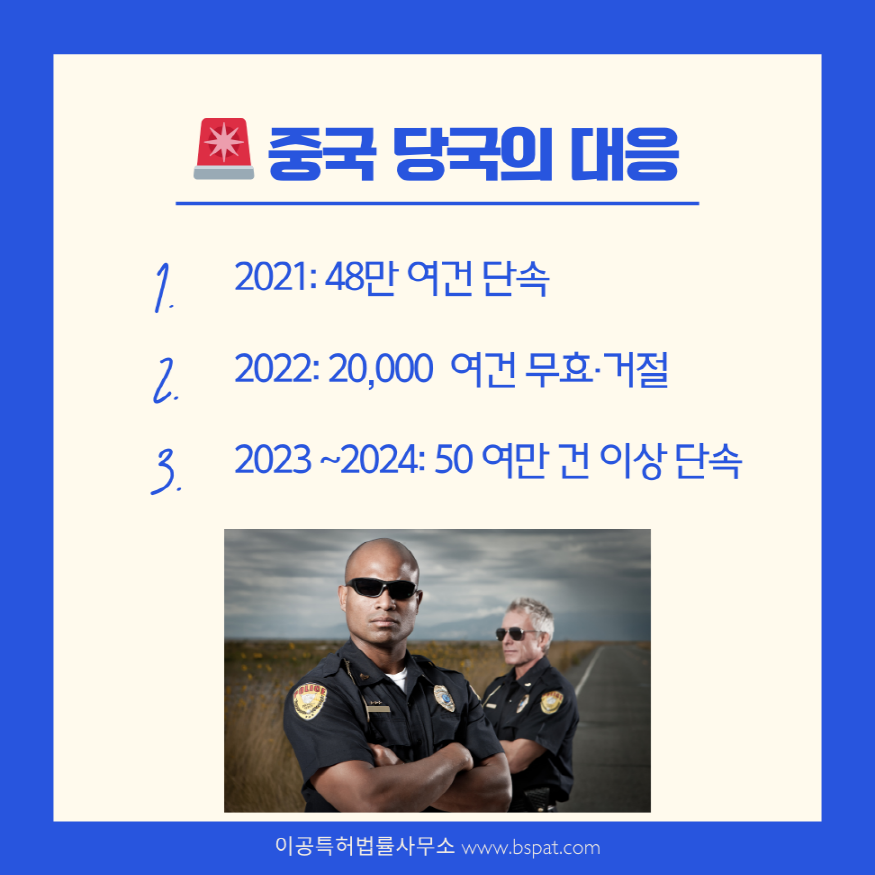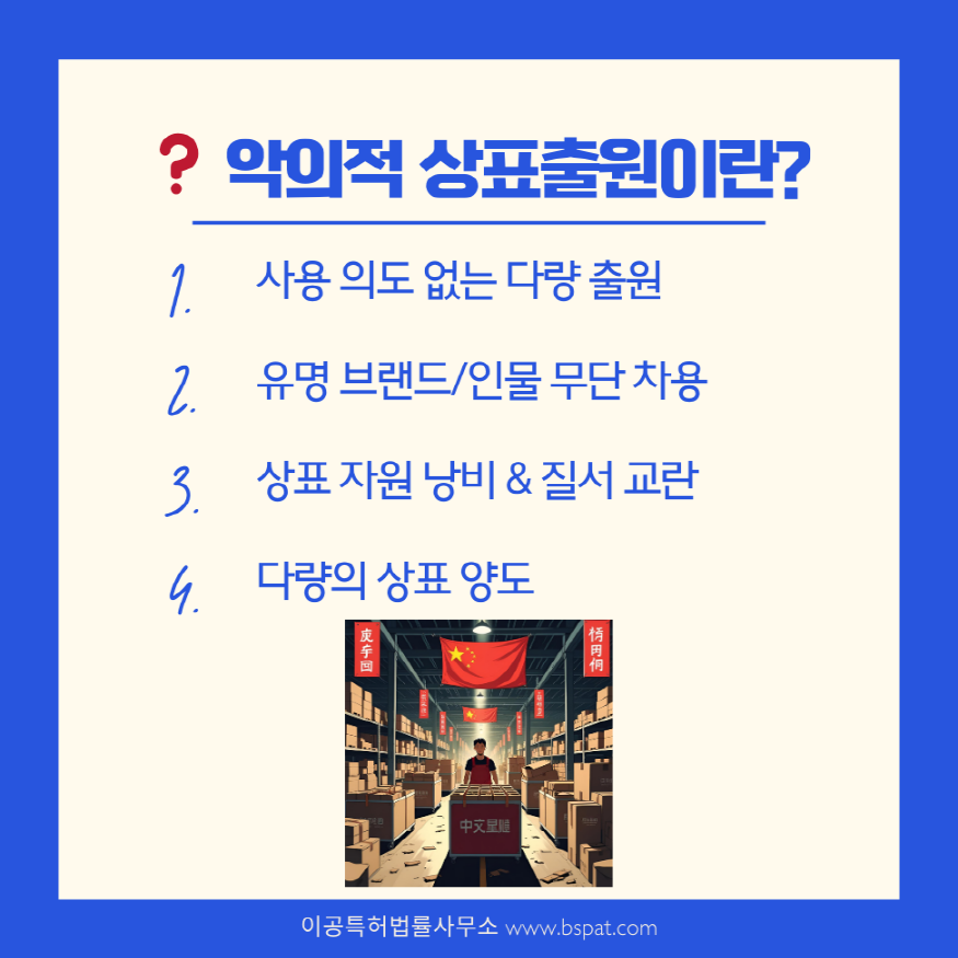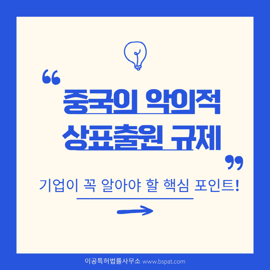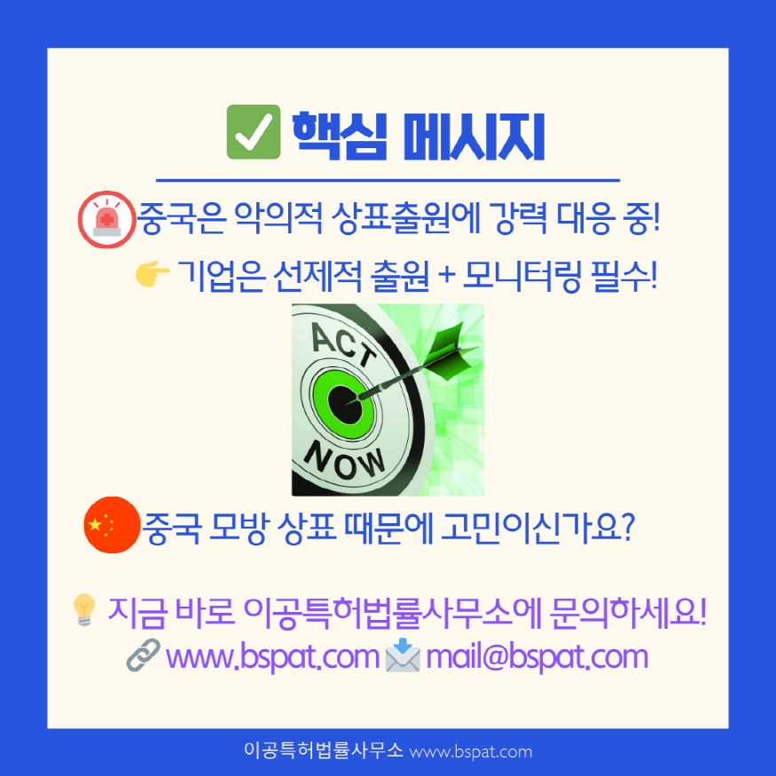 🚨 유명 브랜드·인물 도용, 관광지 이름 무단 출원 등 수많은 사례가 있었고, 이에 중국 당국은 매년 수십만 건의 단속과 거절·무효 결정을 내리고 있습니다. 📩 자세한 사항은 #이공특허법률사무소에 지금 바로 문의하세요. 📧 mail@bspat.com ![]() ![]() ![]() ![]() ![]() ![]()