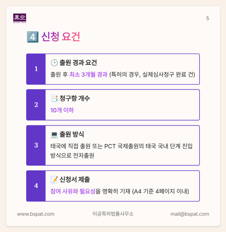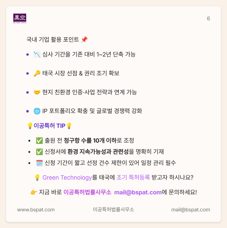 Green Technology에 대해서는 태국에서도 특허우선심사가 가능합니다👍 👉 하지만, 역시 신청기한, 청구항 개수, 필요성 소명 등에 대한 특별한 전략이 꼭 필요합니다! 🤔 혹시 지금 태국특허등록증 때문에 고민하고 계신가요? ✅ 카드뉴스에서 해법을 확인해 보세요! 📩 자세한 사항은 #이공특허법률사무소에 지금 바로 문의하세요. 📧 mail@bspat.com ![]() ![]() ![]() ![]() ![]() ![]()