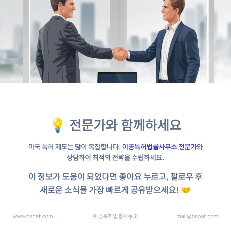 💡 미국에서 특허를 빠르고 효율적으로 등록하고 싶다면, 꼭 확인해보세요! 📩 자세한 사항은 #이공특허법률사무소에 지금 바로 문의하세요. 📧 mail@bspat.com ![]() ![]() ![]() ![]() ![]() ![]()