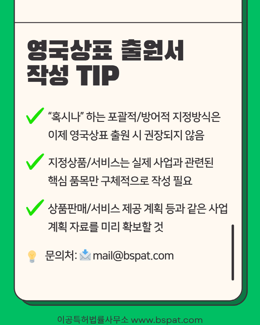 🇬🇧 상표출원을 계획하고 계시다면 꼭 확인해보세요. 📩 자세한 사항은 #이공특허법률사무소에 지금 바로 문의하세요. 📧 mail@bspat.com