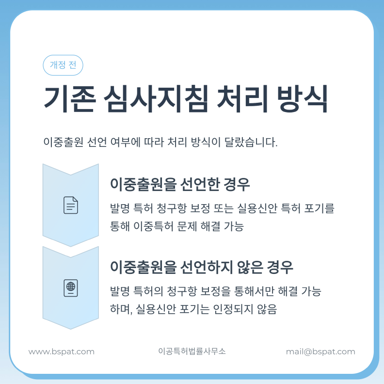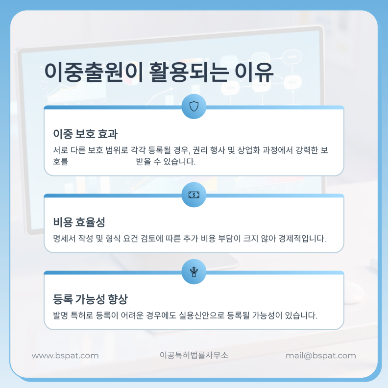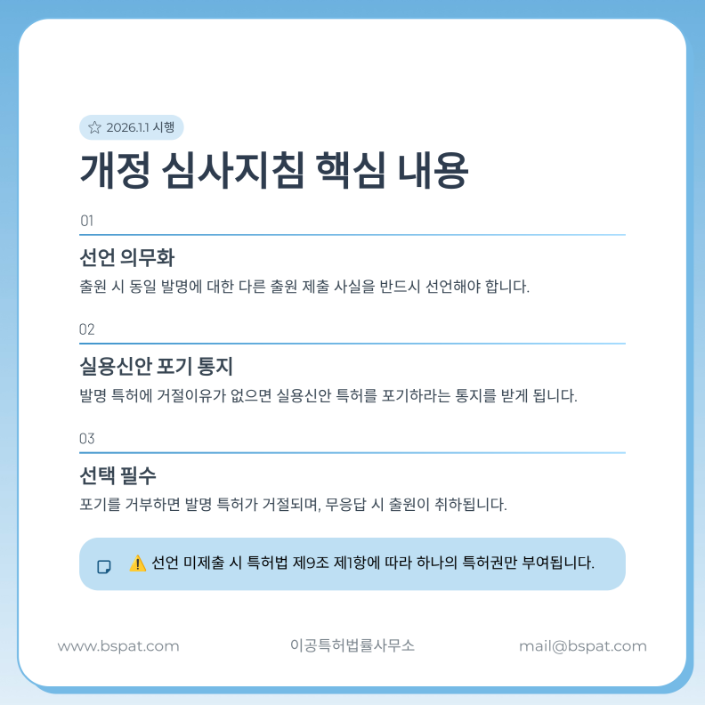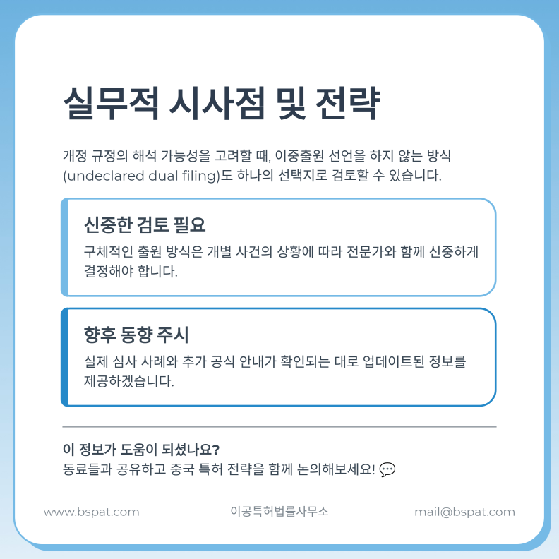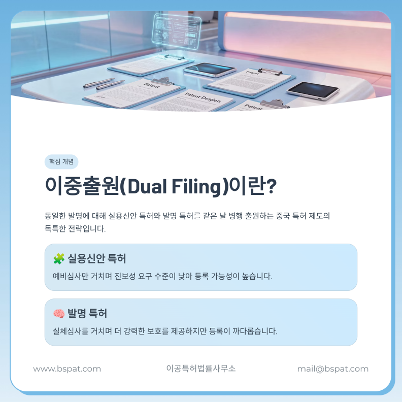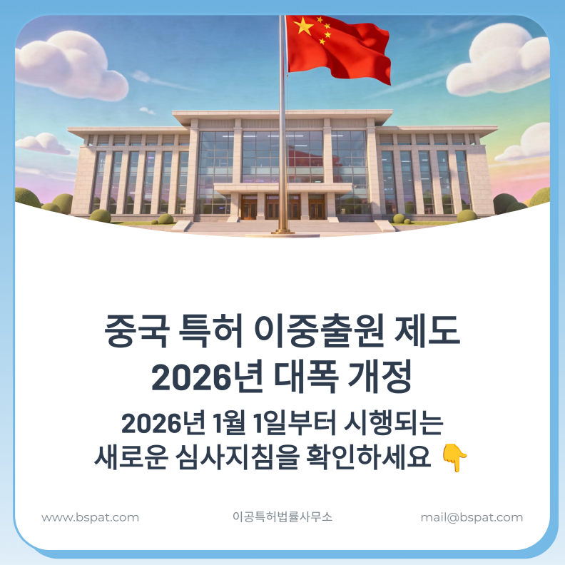 중국지식재산권국(CNIPA)은 2025년 11월 특허 심사지침을 개정하고, 2026년 1월 1일부터 새로운 이중출원(Dual Filing) 규정을 적용하고 있습니다. 그동안 많이 활용되던 ‘실용신안 + 발명 특허 동시 출원’ 방식에도 중요한 변화가 생겼는데요, 실무에서 꼭 알아 두셔야 할 핵심 포인트를 카드뉴스로 정리했습니다. 🔎 카드뉴스로 한눈에 확인해 보세요 👀 📩 자세한 내용이 궁금하시다면 #이공특허법률사무소로 지금 바로 문의해 주세요. 📧 mail@bspat.com ![]() ![]() ![]() ![]() ![]() ![]() ![]()