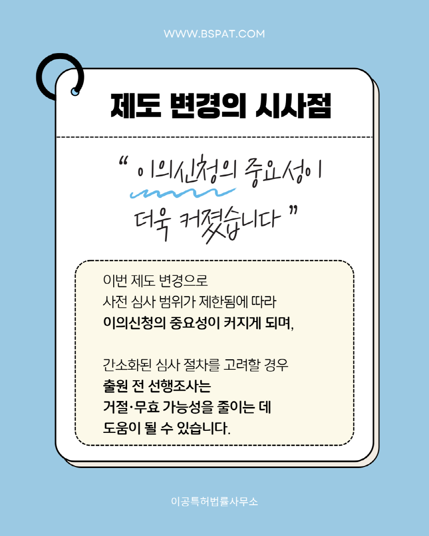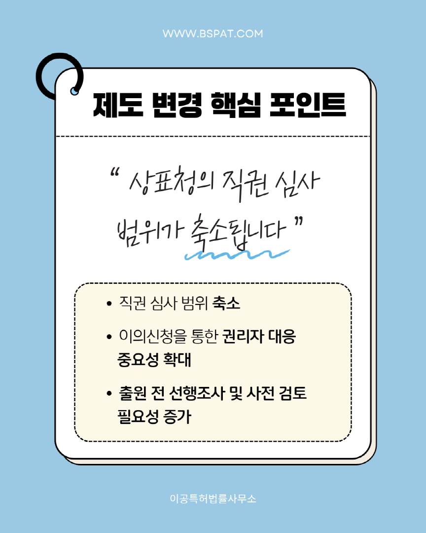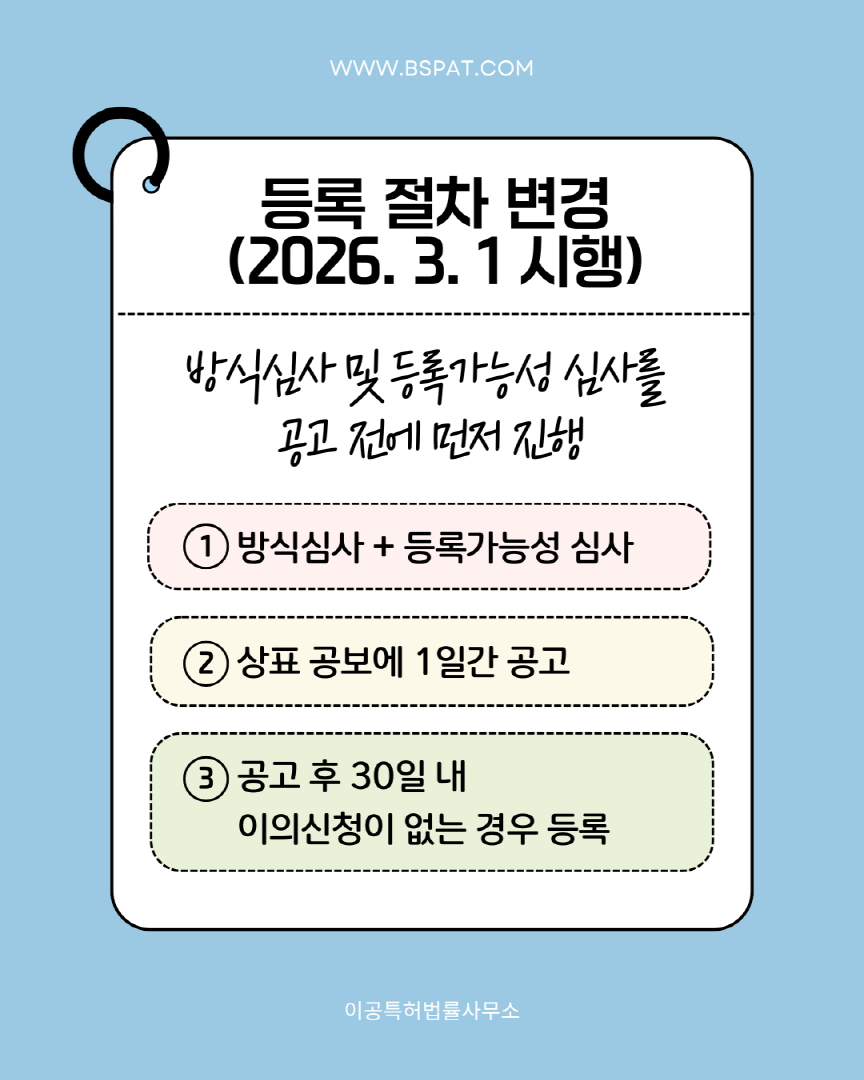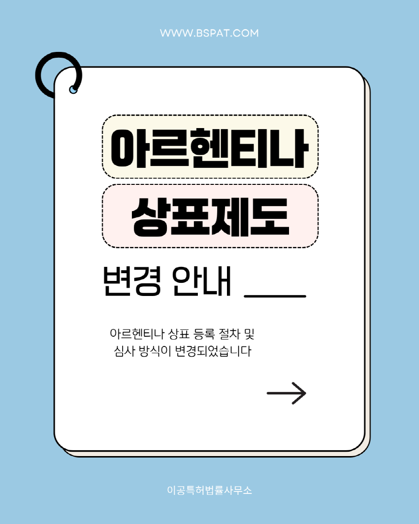 아르헨티나 상표 등록 절차와 심사 방식에 중요한 변화가 생겼습니다. 🔍 이번 제도 변경 핵심 ✔ 상표청 직권 심사 범위 제한 ✔ 이의신청의 중요성 확대 ✔ 등록 절차 변경 실무에서 꼭 알아두셔야 할 내용을 📑 카드뉴스로 한눈에 정리했습니다. 📩 제도 변경과 관련해 궁금하신 사항이 있으시면 # 이공특허법률사무소로 문의해 주세요. 📧 mail@bspat.com ![]() ![]() ![]() ![]() ![]() ![]()